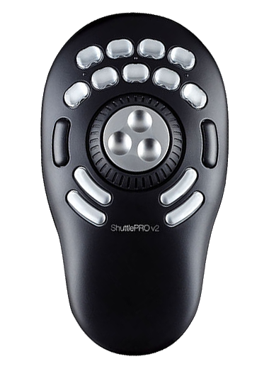 Das ergonomisch geformte ShuttlePRO V2 von Contour Design bietet neben einem griffigen, gummierten Shuttle Mechanismus ein Jog-Rad aus Aluminium. Dieses Jog-Rad hat deutlich mehr Masse als viele andere Jog-Shuttles und ermöglicht mit seinen drei Griffmulden und der feineren Rasterung ein angenehmeres Arbeiten.